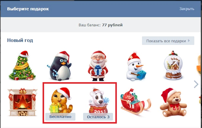 Знаешь ли ты что ВКонтакте существуют бесплатные подарки? Даже если ты знаешь то скорее всего ты не знаешь как их получить.Получаются они очень просто ведь чтобы получить бесплатные подарки не нужно выполнять задания.Итак чтобы получить бесплатные подарки (их обычно три) нужно зайти в магазин подарков какой- нибудь значимый праздник например : Новый Год ,8 марта или 23 февраля . Мелочь а приятно.