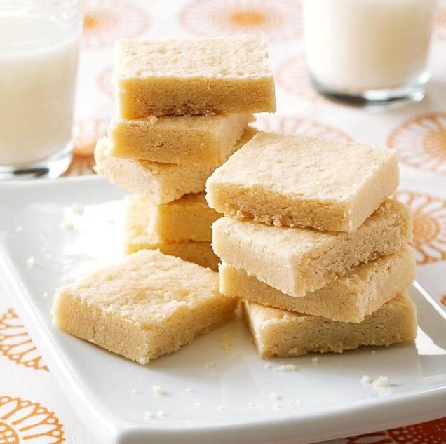 Ингредиенты: 4 стакана пшеничной муки 1 стакан сахара 450 гр замороженного сливочного масла в кубиках Порядок действий: Разогрейте духовку до 160°с. В большой миске смешайте муку и сахар. Разрезайте масло до тех пор, пока смесь не станет похожа на мелкие крошки. Замесите тесто до однородной массы, около 6-10 раз. Выложите тесто на не смазанный маслом противень размером 38см x 25 см и глубиной 2 см. Попротыкайте тесто вилкой. Выпекать следует до слегка коричневого цвета, примерно 25-30 минут. После чего нарежьте теплую выпечку на квадраты и оставьте остывать. Сведения о питательных веществах: 2 печенья: 244 ккал, 16 г жира (10 г насыщенного жира), холестерин 41 мг, 157 мг натрия, 24 г углеводов (8 г сахара, 1 г клетчатки), 2 г белка.