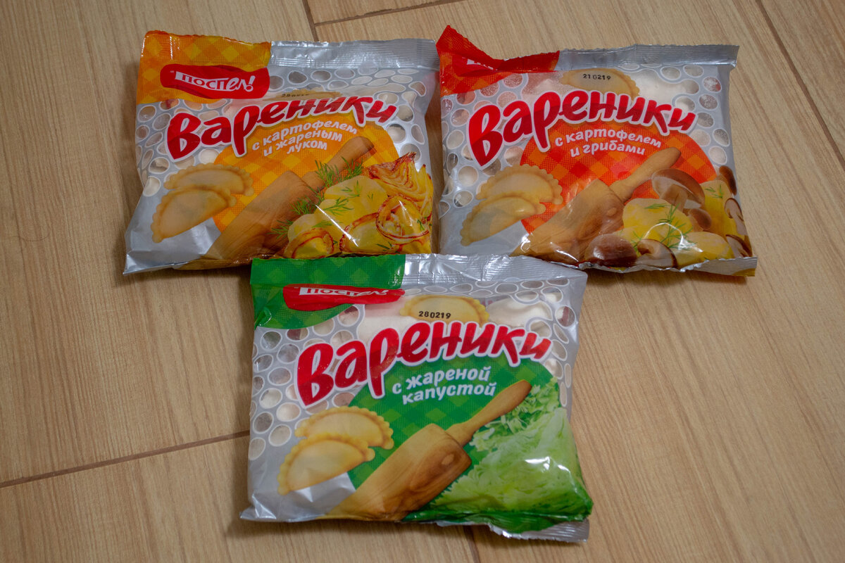 К сожалению, не всегда есть настроение готовить - усталость после работы или учёбы, мало времени или просто "не хочется". Тогда нам на помощь приходит еда, которую можно просто отварить/пожарить. Сегодня мы с вами посмотрим на вареники "Поспел!" и определим, можно ли их есть и стоит ли ими забить свою морозилку. Среди их постной продукции есть 3 варианта: Все 3 пачки весят по 350 грамм. Эти вареники продаются во многих магазинах, как маленьких, так и крупных. Из сетевых супермаркетов я их видел в Ашане и в Магните. Посмотрим на состав Вареники с картофелем и жареным луком: Состав: картофельные хлопья (картофель, эмульгатор Е471, антиокислитель Е330, краситель Е100 куркумин), лук жареный (лук репчатый очищенный, масло растительное), мука пшеничная в/с, вода питьевая, растительное масло, соль, перец. Вареники с картофелем и грибами: Состав: картофельные хлопья (картофель, эмульгатор Е471, антиокислитель Е330, краситель Е100 куркумин), грибы, лук, мука пшеничная в/с, вода питьевая, р
