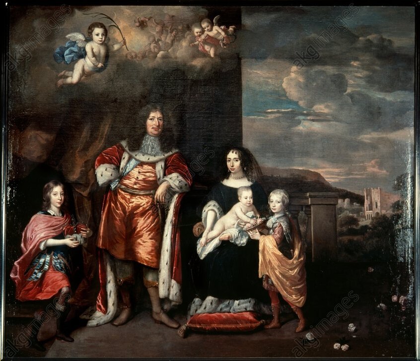 Этот портрет был написан голландским художником Яном Мейтенсом (1614-1670) в 1666 или 1667 году. В настоящее время хранится в охотничьем дворце Грюневальд. На портрете изображён курфюрст Фридрих Вильгельм Бранденбургский (1620-1688) и его первая жена Луиза Генриетта Нассау-Оранская (1627-1667) вместе с тремя сыновьями. Старший, Карл Эмилий (1655-1674), стоит слева и держит курфюршескую корону. Средний сын Фридрих (1657-1713) стоит справа, рядом с матерью. Младший сын Людовик (1666-1687) на руках у Луизы Генриетты. Три ангелочка в облаках над семьёй вероятно воплощают трёх умерших детей курфюршеской четы, Вильгельма Генриха (1648-1649), Амалию (1664-1665) и её брата-близнеца Генриха (1664). Спустя примерно 15 лет неизвестный придворный художник, работавший при гессен-кассельском дворе, написал вот такую картину: Это портрет ландграфа Карла Гессен-Кассельского (1654-1730) с женой Марией Амалией Курляндской (1653-1711) и тремя детьми - сыновьями Фридрихом (1676-1751) и Карлом (1680-1702