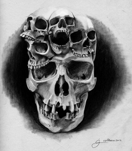 У людей разное отношение к черепам: один человек не приемлет подобные изображения на теле, другой фанатеет от изящных линий и суровости рисунка. В одном эскизе часто совмещают череп и весь скелет, дальше расскажем про оба случая. Как выглядят черепа и образ смерти уже на теле, смотрите в отдельной статье.