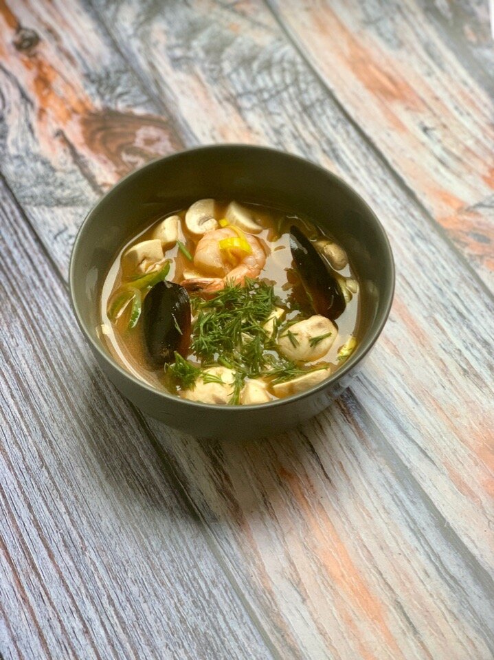Знаете, раньше в азиатских ресторанах я думала - Боже, это так вкусно, так необычно! Сколько же времени они тратят, чтобы приготовить это блюдо! Это же так сложно! А сейчас я большую часть ресторанных блюд готовлю дома за 10 минут, практически не напрягаясь. Спасибо готовым смесям специй и соусов =) Наваристый и пряный Том Ям в московских ресторанах готовят по разному - и с кокосовым молоком, и рисом, и даже курицу умудряются класть! Но основа всегда едина - это определенный набор специй и сок лайма. Вот из чего я обычно делаю данный суп (на кастрюлю 1,5 литра): 1. Грибы (шампиньоны или вешенки) - 200 гр. 2. Креветки королевские - 15 шт. 3. Мидии в створках - 10-13 шт. 4. Соус для супа Том Ям от Sen Soy. 5. Лук порей - 3 см с белой части и 3 см с зеленой. 6. Чеснок - 2 зубчика. 7. Петрушка или кинза - 4 веточки. 8. 1 лимон или 2 лайма - нужен только сок. 9. 1 крупный помидор или томатный соус - 4 ст.л. 10. Вода - 1,2 л. 11. Соль, растительное масло по вкусу Не забываем поставить лайк и