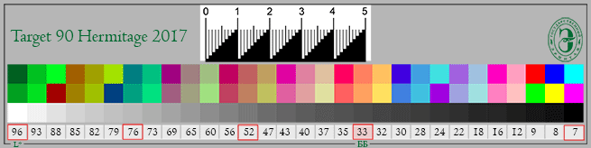 Контрольная шкала T90 Hermitage - создана для контроля цифрового изображения, при создании цифрового архива коллекции Государственного Эрмитажа. Мишень находится на всех кадрах с предметами, живописью, графикой, архивными документами и архивными фотографиями, монетами, геммами и др. предметами искусства в базе цифровых изображений Государственного Эрмитажа, оцифрованных начиная с 2017 года (пришла на смену устаревшей мишени от 2012 года). Она служит эталоном, как доказательство того, что "вещь именно ТАКАЯ и технически съемка была проведена ГРАМОТНО", а так же с её помощью можно, создав профиль icc, подправить TIF или, если это RAW файл, и нет съёмки этой сессии с большими, "взрослыми" мишенями. Или включив эту мишень в группу мишеней создать профиль DCP с помощью программы BasicColor Input для использования его в конвертере ACR, Raw Therapee или любого другого конвертера, который поддерживает DNG профиля. При перевыпуске тиража мишени изменяется год в названии и добавляется её референс.