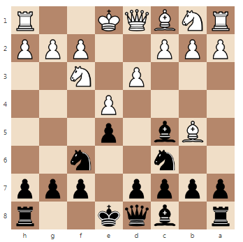 б). 8. Сc1-e3 Сc5:e3! 9. f2:e3 g7-g5!