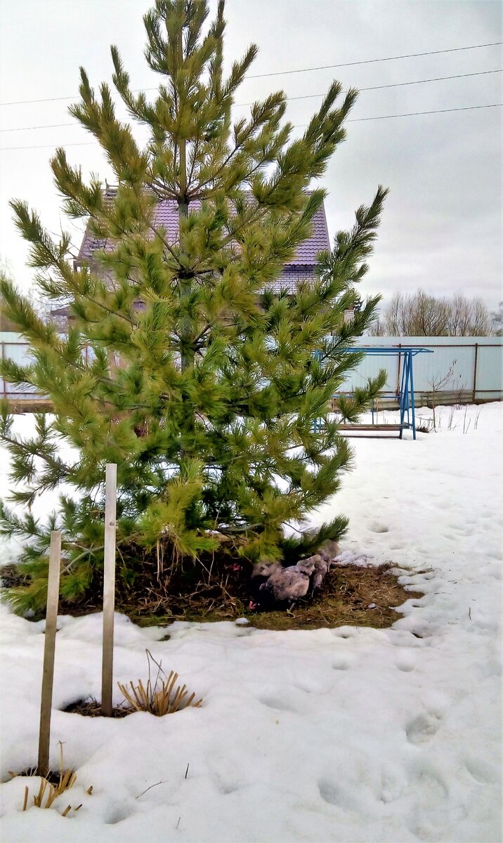 На дворе месяц март. Холода уже всем надоели. Так хочется тепла и солнца, но погода не балует нас. Мои птички просидели всю зиму в курятнике и мечтают о прогулках по земле. В курятнике у них тёплая подстилка, но свежей травы им уже очень хочется. Ветер, который одолевал нас последние дни, стих и я сегодня выпустила своих курочек в сад. С какой радостью они бежали за мной, как дрессированные! Петушок еле за ними успевал. В саду у меня растёт мой любимый кедр, который я вырастила сама из зёрнышка. Ему уже около 16 лет. Под кедром первая проталинка и курочки побежали к ней на прошлогоднюю травку. А под упавшей хвоей пробивается уже новая зелень. Куры её с жадностью поедают. Свежие витамины им необходимы. Ведь они активно неслись всю зиму. Такие умницы. Порода кур называется "Голубой доминант". Это кросс яичного направления. И правда, мои молодки несут крупное яйцо с ярко-оранжевым желтком. Конечно, я кормлю своих кур сытно и разнообразно. Поглядите, какой наполненный зоб у несушки. В ко