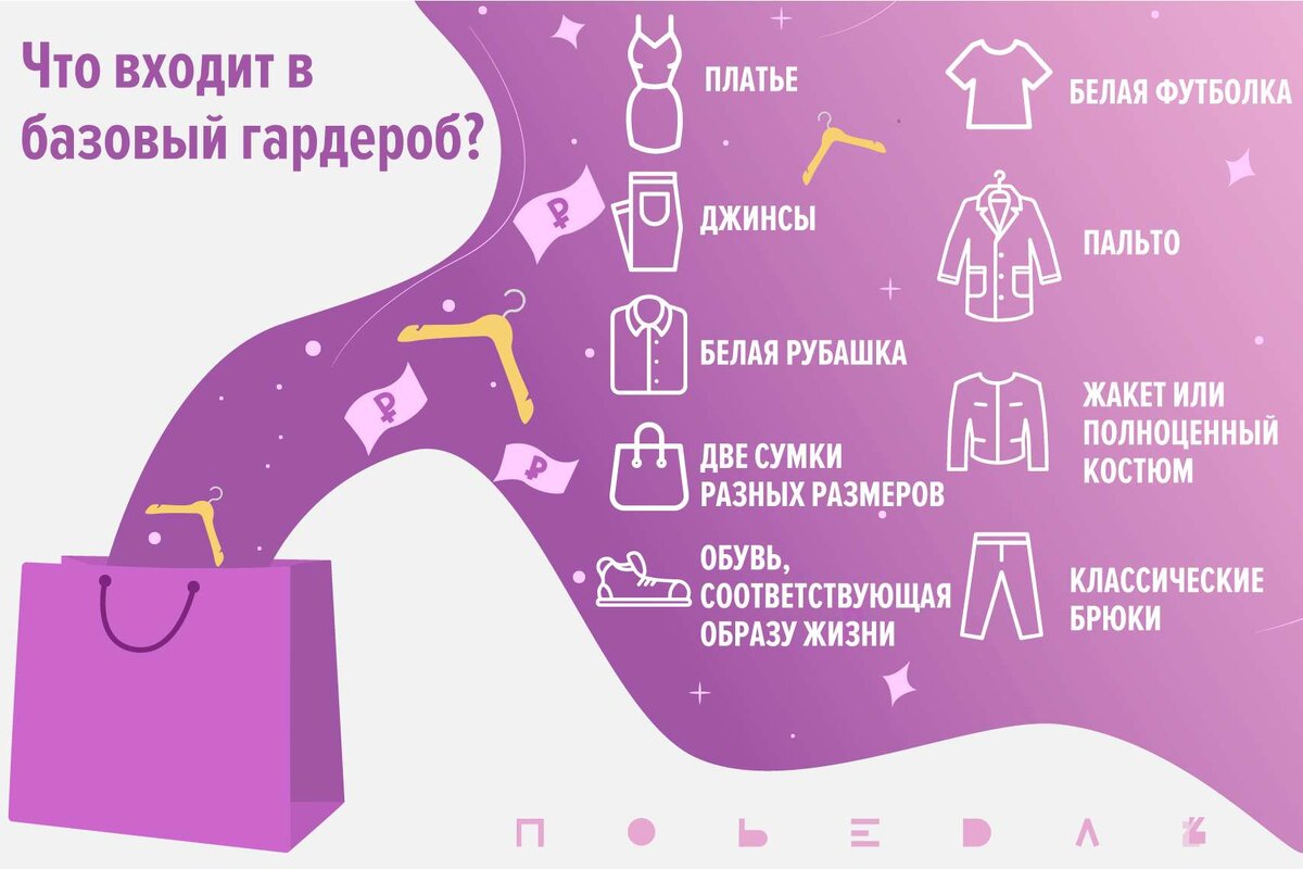 Затем формируется шопинг-лист, с которого и начинается поход по магазинам за одеждой, обувью и аксессуарами. Базовый гардероб подбирается с учётом потребностей, целей и пожеланий клиента. Задача — найти вещи, которые подходят человеку и при этом сочетаются между собой.