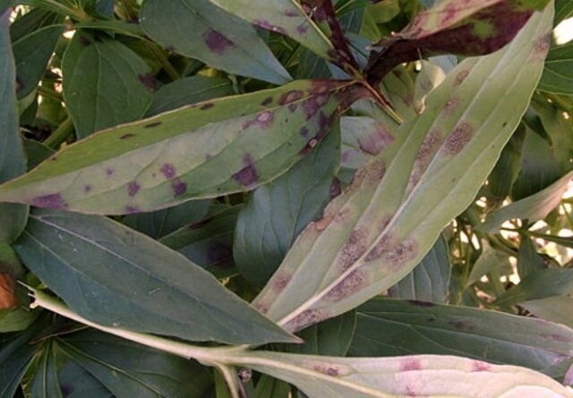 На нижней стороне листьев, по краям и на кончиках видны грибковые споры, а на верхней стороне в этих местах образуются синие, фиолетовые или светло-коричневые пятна.