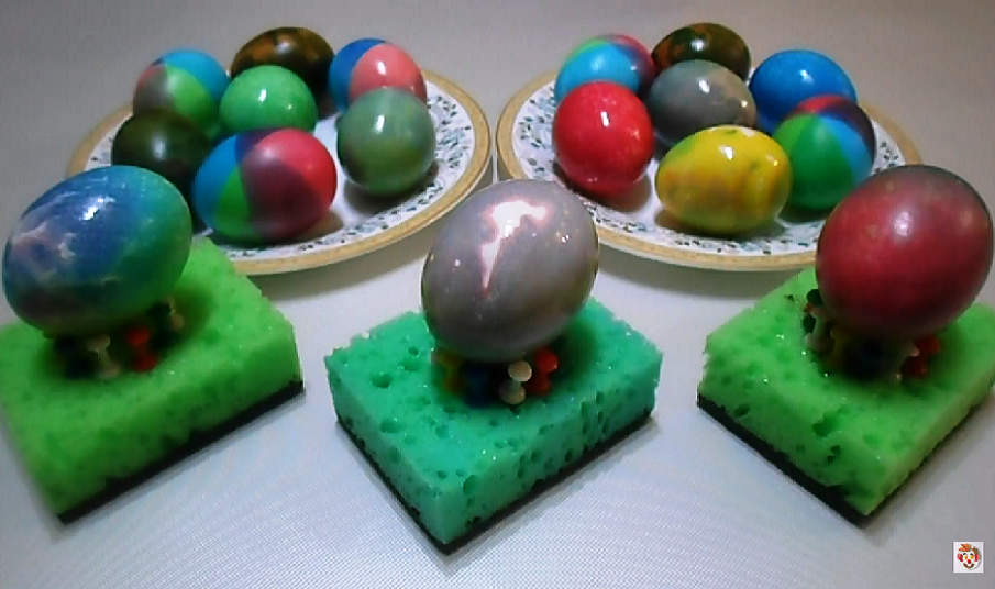 В этом году Пасха выпадает на 28 апреля. И хотя времени еще достаточно, многие уже готовятся к этому Великому Празднику. Сегодня хочу рассказать вам как можно с помощью обычных красителей получить очень красивые и необычные Пасхальные яйца. Все легко и просто, к тому же очень интересно! А рисунок на каждом из яиц получается неповторимым! Весь процесс приготовления можно посмотреть в моём коротеньком видео-ролике, который размещен в конце публикации. Сразу отмечу, что: - яйца должны быть вареными и желательно горячими; - красители разводим согласно указаниям на упаковке; - для того, чтобы краситель лучше ложился, вареные яйца непосредственно перед окрашиванием протираем уксусом; - для придания яйцам блеска, после окрашивания натираем их растительным маслом, излишки убираем бумажной салфеткой - подставку для сушки яиц можно соорудить из обычной кухонной губки и канцелярских кнопок. Итак, приступим... Способ №1: Берем 3 красителя (у меня: красный, синий и зеленый), макаем под наклоном я