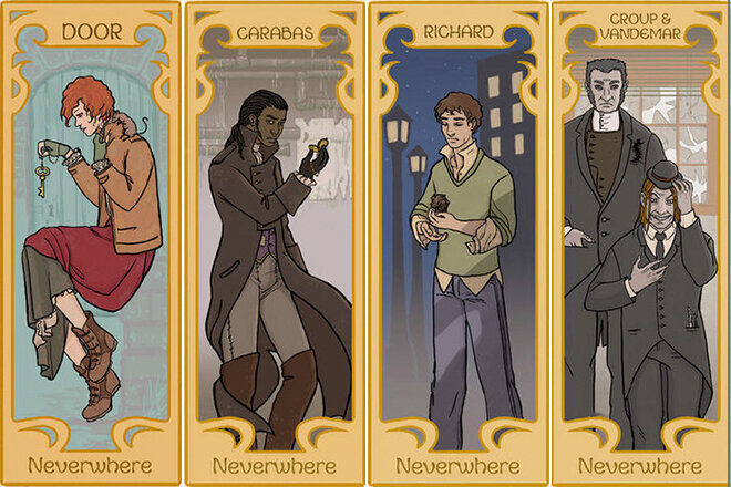 Нил Гейман в далеком 1996 году написал сценарии для одноименного сериала - «Neverwhere». Посмотрел на свое творение, и понял - «А ведь можно и лучше!». Так родился его первый, сольный роман «Никогде». Именно такой перевод правильный, а вот альтернативное название «Задверье», точнее передает идею романа. Сюжет раскрывает историю Ричарда Мэйхью, с недавних пор жителя Лондона. У него есть работа в офисе и планируется помолвка. Обычный житель мегаполиса. И вот случайно встретив незнакомку, которой необходима первая помощь, приводит себе домой - девушка просит обойтись без больницы. С этого момента он попадает в водоворот событий, которые ставят под угрозу его нормальную жизнь. Он втянут в Нижний Лондон — параллельно существующий с «обычным» Верхним Лондоном, мир. Девушку зовут Дверь, и если решить её проблему, есть шанс решить и свою. Героям помогут спутники в виде «должника» Маркиза де Карабаса и сильнейшей Охотницы. А помогать есть в чем, за ними по следам идут кровавые наемники —