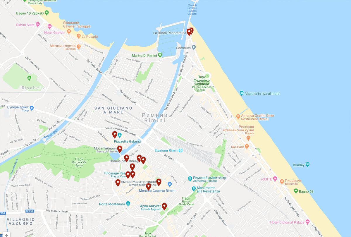 Расположение города достаточно удобно для путешествия в общем по Италии, из Римини удобно делать поездки как на север, так и на юг Италии. Но и сам город так же интересен для изучения. Предлагаю ознакомиться с этим итальянским городом, что бы спланировать свой маршрут.