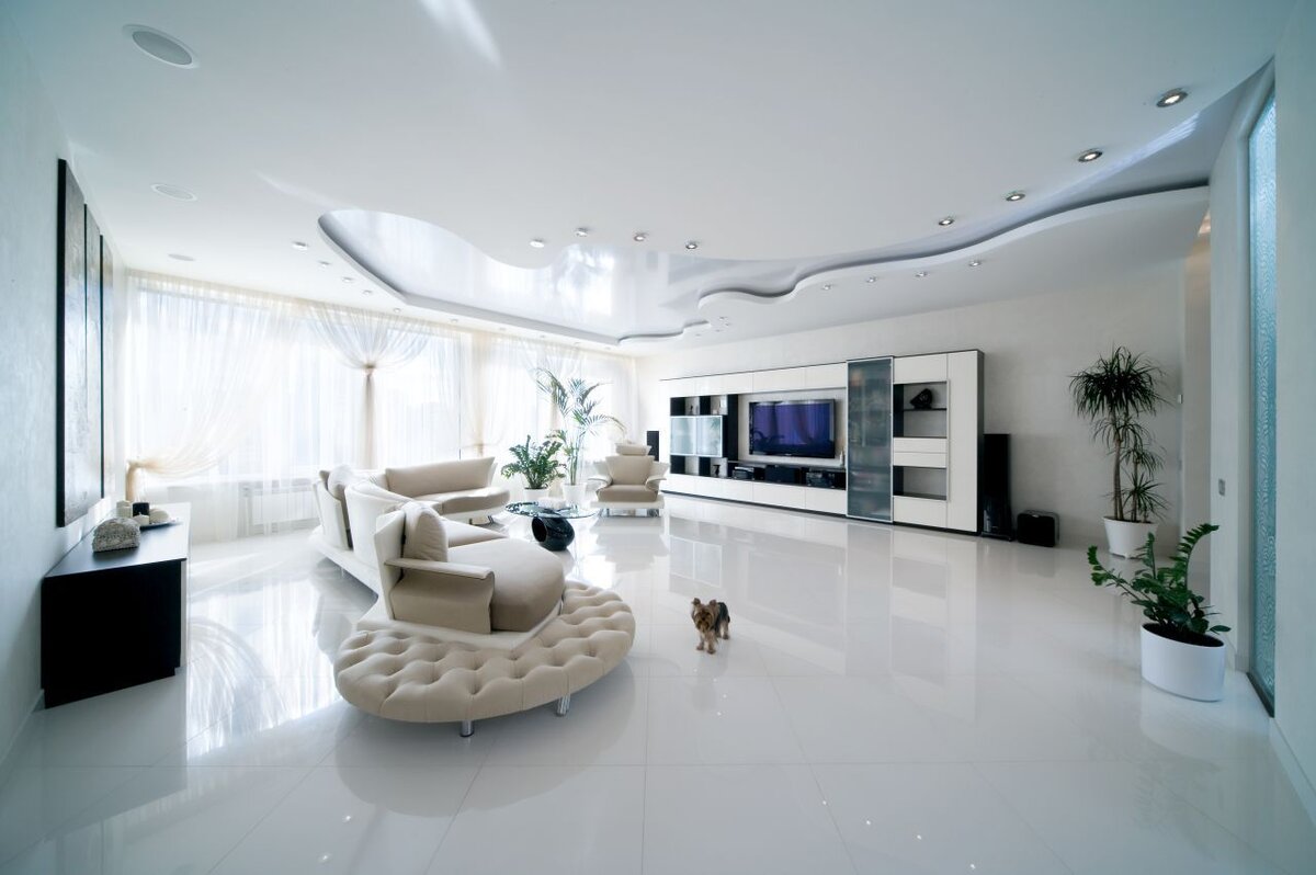 Обычно гостиная используется для встречи гостей, семейных торжеств, праздничных обедов. Поэтому важно продумать все детали: стиль, цветовую гамму, материалы, которые будут использованы в отделке. Если ремонт в гостиной уже сделан, можно произвести монтаж потолка, не нарушая убранство. Сегодня для создания натяжных потолков используется поливинилхлорид (ПВХ) — это сравнительно недорогой, экологичный и прочный материал. Основными достоинствами ПВХ-волокна считаются: устойчивость к влаге и к выгоранию цвета. Этот материал износостойкий, что дает возможность его эксплуатации более 10-15 лет, и прост в уходе — достаточно протирать полотно влажной салфеткой 2 раза в год. Виды натяжных потолков Выбирая натяжные потолки для своей гостиной или зала, вы можете подобрать: Правильный выбор натяжных потолков в гостиную комнату решает ряд проблем: поверхность потолка всегда идеально ровная. Натяжные потолки не поглощают неприятные запахи, разнообразны по цвету, текстуре, форме. В отличие от гипсок