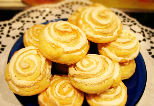 Растительное масло Размягченное сливочное масло смешиваем с творогом, мукой, 2 желтками, солью и содой. Творог можно предварительно протереть через сито. Замешиваем эластичное тесто. Оно не должно прилипать к рукам. Тесто убираем в холодильник на 1-1,5 часа. Теперь взбиваем охлажденные яичные белки со стаканом сахара. Творожное тесто раскатываем в пласт толщиной 0,5 см. Смазываем взбитыми яичными белками с сахаром. Теперь сворачиваем рулетиком и нарезаем его на кусочки. Получившиеся печенья выкладываем на противень, смазанный маслом и присыпанный мукой. Выпекаем в духовке при температуре 220 градусов до золотистого цвета. Готовые печен