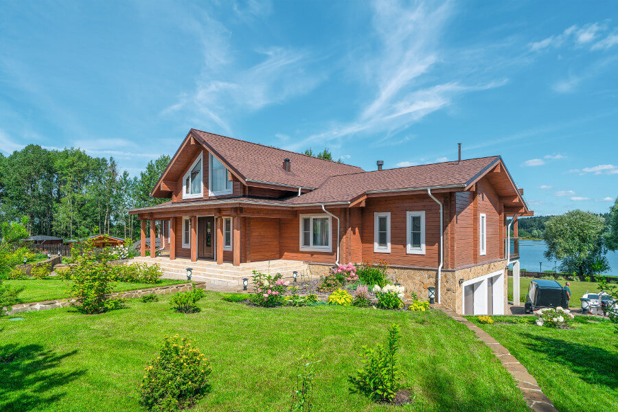 Авторы проекта: архитектор-дизайнер Елена Французова Подмосковный дом с цокольным этажом из бетона и двумя этажами из клееного бруса возведен на просторном участке на первой береговой линии Рузского водохранилища. Перед автором проекта стояла задача вписать постройку в сложный прибрежный ландшафт с большими перепадами высот. Другое требование заказчиков — чтобы из основных помещений и с веранд открывались красивые панорамные виды на воду. Обе задачи решены на высоком профессиональном уровне. Нижний бетонный уровень дома облицован натуральным песчаником. Верхняя часть возведена из клееного бруса сечением 200 х 185 мм, покрытого тонирующим маслом. Стеклянные ограждения и большой навес над террасой второго этажа придали зданию индивидуальность. Внутренняя планировка обусловлена особенностями деревянного строения. На цокольном уровне рядом с сауной расположена ко
