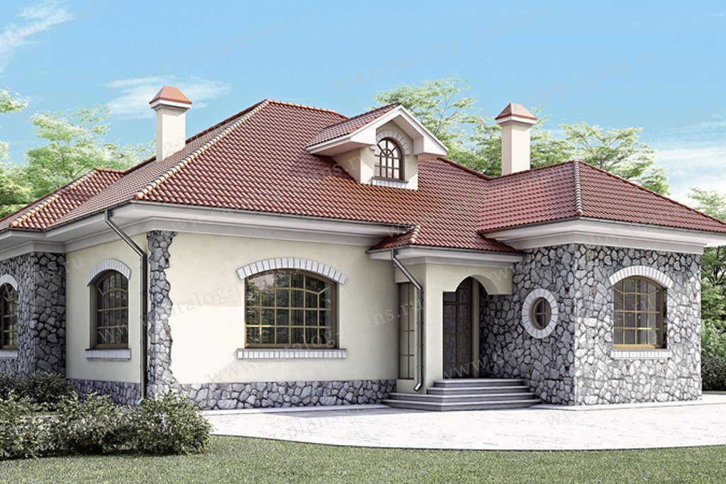 Проект этого элегантного одноэтажного жилого дома из кирпича, удачно сочетает в себе уют загородного дома и эстетичный внешний вид. Размеры дома 15х15 метров, общая площадь — 145м2. Дом отлично подойдет для постоянного проживания семьи из четырех человек. В качестве наружного декора используется штукатурка и камень, которые подчеркивают немецкий архитектурный стиль, в котором выполнен проект дома. Чердачная крыша покрыта мягкой черепицей, а в качестве фундамента и перекрытий был выбран сборный железобетон. Войти в дом можно только через главное крыльцо, и пройдя через тамбур оказаться в общем холле. На первом этаже жилая зона представлена тремя просторными светлыми спальнями. В доме имеется два санузла, один из которых удачно расположен недалеко от входа, а второй между двух спален. Гостиная представляет собой двухсветное пространство с камином и большими окнами. Кухня-столовая так же является двухсветным пространством и находится справа от входа. Еще на первом этаже находится небольша