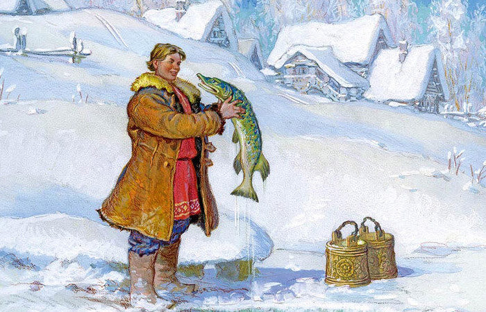 Жил-был бедный мужичок; сколько он ни трудился, сколько ни работал — все нет ничего! «Эх, — думает сам с собой, — доля моя горькая! Все дни за хозяйством убиваюсь, а того и смотри — придется с голоду помирать; а вот сосед мой всю свою жизнь на боку лежит, и что же? — хозяйство большое, барыши сами в карман плывут. Видно, я богу не угодил; стану я с утра до вечера молиться, авось господь и смилуется». Начал он богу молиться; по целым дням голодает, а все молится. Наступил светлый праздник, ударили к заутрене. Бедный думает: «Все люди станут разгавливаться, а у меня ни куска нету! Пойду хоть воды принесу — ужо вместо щей похлебаю». Взял ведерко, пошел к колодцу и только закинул в воду — вдруг попалась ему в ведерко большущая щука. Обрадовался мужик: «Вот и я с праздником! Наварю ухи и всласть пообедаю». Говорит ему щука человечьим голосом: «Отпусти меня, добрый человек, на волю; я тебя счастливым сделаю: чего душа твоя пожелает, все у тебя будет! Только скажи: по щучьему веленью, по божьему благословенью явись то-то и то-то — сейчас явится!» Убогий бросил щуку в колодец, пришел в избу, сел за стол и говорит: «По щучьему веленью, по божьему благословенью будь стол накрыт и обед готов!» Вдруг откуда что взялось — появились на столе всякие кушанья и напитки; хоть царя угощай, так не стыдно будет! Убогий перекрестился: «Слава тебе господи! Есть чем разговеться». Пошел в церковь, отстоял заутреню и обедню, воротился и стал разгавливаться; закусил-выпил, вышел за ворота и сел на лавочку.
