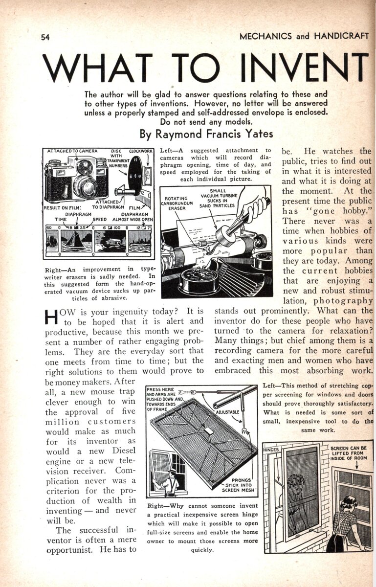 Остается надеяться, что это бдительно и продуктивно, потому что в этом месяце мы представляем ряд довольно интересных проблем. Они являются повседневным видом, который встречается время от времени; но правильные решения для них оказались бы прибыльными. В конце концов, новая ловушка для мыши, достаточно умная, чтобы получить одобрение пяти миллионов покупателей, принесет столько же изобретателю, сколько новый дизельный двигатель или новый телевизионный приемник. Усложнение никогда не было критерием для производства богатства в изобретении - и никогда не будет.