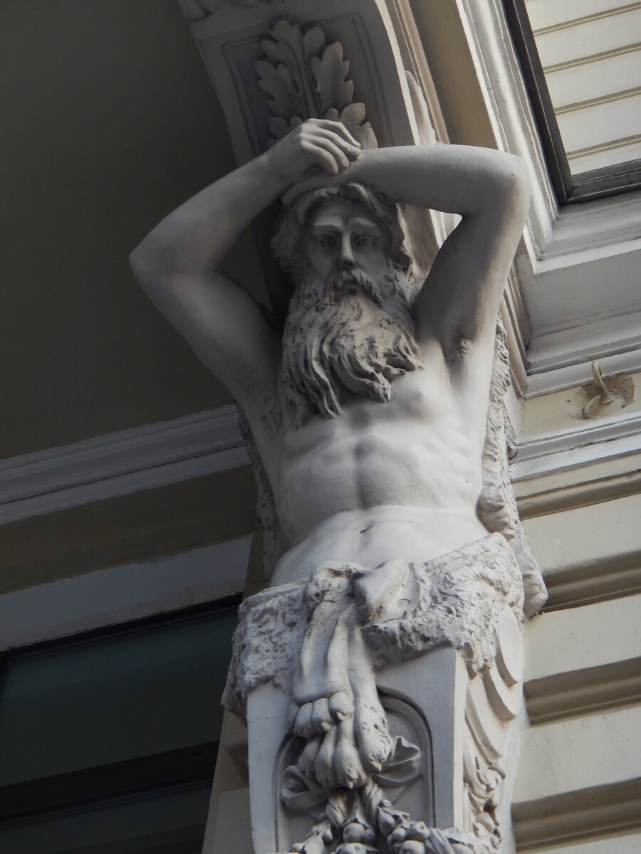 Атланты и кариатиды, пожалуй, самые многочисленные каменные жители Санкт-Петербурга. Проходя по улицам и подняв глаза, Вы часто встретите их взгляд, который при некоторой фантазии можно прочитать как зависть к тому, кто вот так вот свободно проходит мимо. И да, работа у них тяжелая, и отлучиться нельзя. Атлант – в древнегреческой мифологии могучий титан, который на своих плечах держит небесный свод. В архитектуре же ему предназначена роль несколько скромнее – поддерживать балконы, крыши, карнизы, иногда роль атлантов функциональная, а иногда чисто декоративная. Кариатиды выполняют по сути ту же работу (в архитектуре), но на поддержку небесного свода не претендуют. Название «кариатида» по легенде произошло от города Кария в Аркадии. Там на праздниках в честь богини Артемиды девушки танцевали с корзинами на головах. В Древней Греции женские стоящие статуи часто заменяли собой колонны, и держали свой груз не на плечах, а прямо на голове. В Санкт-Петербурге сам