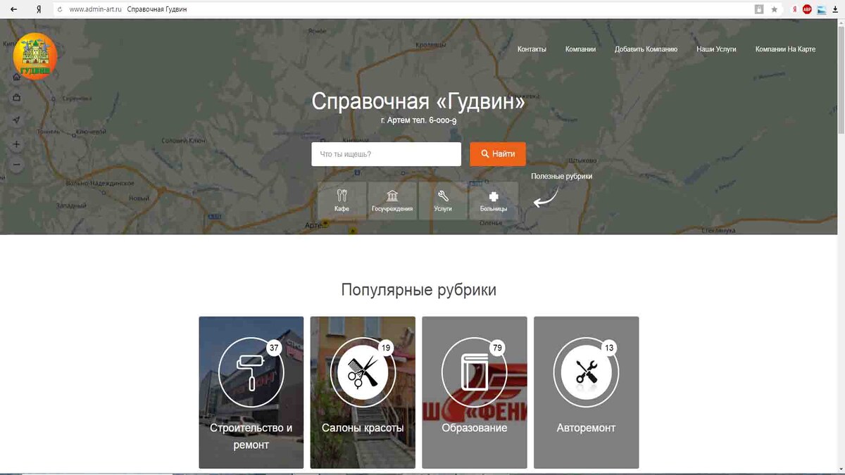 Справочная телефонная служба по товарам и услугам г.Артема: — бесплатно предоставляет информацию о Вашей компании по телефонам 60-009, 33-508 — размещает информацию о Вашей компании на сайтах: www.admin-art.ru