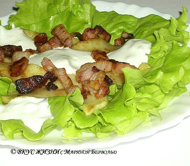 5. Теперь на блюдо рвем салат. Щедро поливаем его оливковым маслом и лимонным соком. Выкладываем сначала яблоки, пока они еще теплые. Затем сверху – бекон. Все заливаем сметанно-сырным соусом и оставляем пропитаться хотя бы на четверть часа.