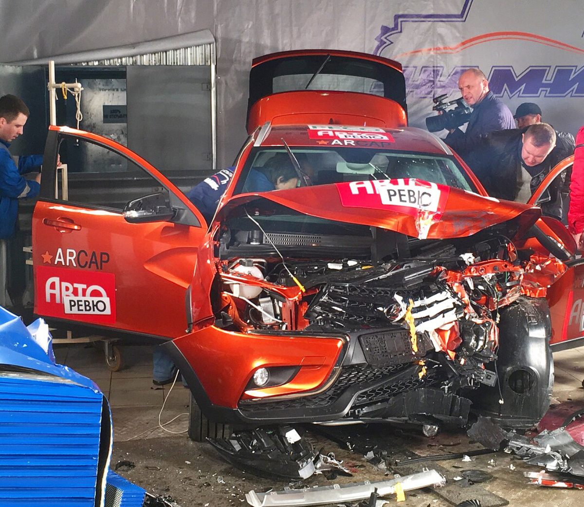Газета «Авторевю» опубликовала результаты фронтального краш-теста Lada Vesta SW Cross по собственной методике ARCAP. Правила тестов базируются на протоколе EuroNCAP — фронтальный удар о 40-процентное деформируемое перекрытие со скорости 64 км/ч (плюс-минус 1 км/ч). Седан Lada Vesta по методике ARCAP разбивали в 2016 году. Та машина заработала максимальные 4 звезды и 13,9 балла из 16 возможных. Но кросс-универсал отличается большей снаряженной массой (1298 кг против 1150 кг) и более крупными колесами (17 против 15 дюймов). К тому же все Весты за последние два года получили более прочные усилители порогов, которые отштампованы из стали толщиной 1,5 мм (прежде было 0,8 мм). В ходе удара передняя стойка кузова «Кросса» ушла назад на 10 мм — на 6 мм больше, чем у седана. Подушки безопасности фирмы Takata сработали безупречно — приняли «лица» манекенов точно по центру, без пробоев и соскальзываний. Интегральный критерий повреждения головы для обоих манекенов (HIC) не превысил допустимого з