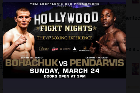 Промоушен Тома Лоффлера ознаменовал возвращение серии «Hollywood Fight Nights» в воскресенье, 24 марта 2019 года, на AVALON в Голливуде, Калифорния, с главным событием в виде боя в супер-полусреднем весе, в котором участвует один из лучших непобежденных проспектов Сергей «Эль Флако» Богачук, (12-0, 12 нокаутов), из Украины, тренирующийся в Big Bear, CA и опытного бойца Клеотиса 'Mookie' Пендарвиса, (21-4-2, 9 нокаутов), из Лос-Анджелеса, CA. «Бой между Сергеем Богачуком и Клеотисом Пендарвисом - большое главное событие для нашего следующего шоу в серии Hollywood Fight Nights», - сказал Лоффлер. «Богачук - один из самых многообещающих молодых боксеров из супер-полусреднего веса, он быстро набирает обороты с тех пор, как два года назад стал профессионалом, и против Пендарвиса он встретится с жестким противником левшой. Это четвертый бой Бохачука в « Hollywood Fight Nights », где он является одним из самых популярных бойцов Южной Калифорнии ». «Поклонники подтверждают успех наших меропр