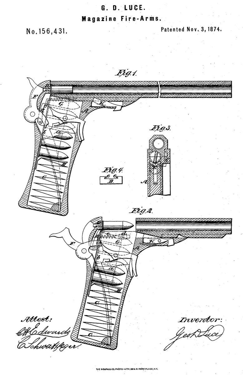 Принято считать, что предком современных пистолетов является модель С-93 немецкого оружейника Хуго Борхардта (Hugo Borchardt) – главным образом речь идет о размещении магазина в рукояти. Однако, почти за двадцать лет до этого, в 1874 году, подобную идею высказал американский изобретатель Георг Люце (George D. Luce), о чем и свидетельствует полученный им патент за номером US 156,431 A.