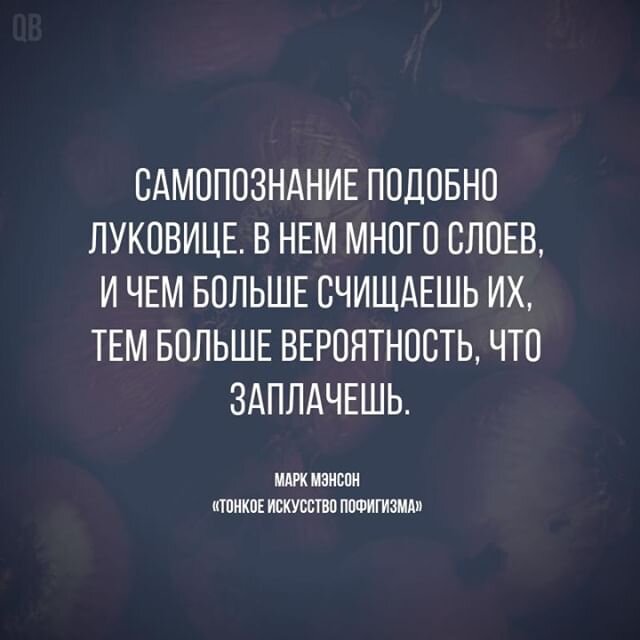 Книга Марка Мэнсона «Тонкое искусство пофигизма» взорвала читательские рейтинги в 2018 году. Все дело в ее интригующем названии и не менее провокационном содержании. Но несмотря на категоричность и бескомпромиссность некоторых заявлений, в основе идей автора лежит вполне уместный подход к жизни — не стоит ввязываться в бесконечную гонку за успехом и переживать обо всем на свете. Обратите внимание на эту книгу, а для знакомства с ней и стилем автора, подобрали несколько любопытных цитат: О самовнушении Помните: ни один человек, который и в самом деле счастлив, не будет торчать перед зеркалом и внушать себе, что он счастлив. О принятии неизбежного Куда бы вы ни пошли, вас поджидает огромная куча дерьма. И это — норма. И задача состоит не в том, чтобы убежать от дерьма. Она состоит в том, чтобы найти дерьмо, с которым вам понравится иметь дело. Об отношении к проблемам Ощущаете себя хреново? Наплюйте на это. Скажите себе: «Да, мне хреново. Ну и что с того?» Вот вам и выход из заколдованно