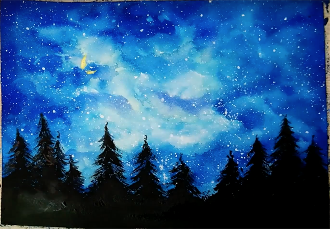 Для начала нарисуем небо. Цвета синего, голубого, фиолетового — никак не стыдитесь проводить эксперимент. Мой вам совет: акварель правильнее наносить на мокрую бумагу, в итоге она станет прекрасно растекаться и формировать мягкие переходы. Далее немного добавим деталей в картину. Тут можно рисовать "по сухому" — тогда мазки будут более чёткими. Набрызгаем звездочек :) Для этого возьмите белую краску и нанесите её на кисть, и хорошо встряхните над картиной. Получатся белые крапинки, похожие на звёздное небо. Набросим силуэты елей, картина же в лесу! Их высота будет примерно трети части рисунка. Друзья! Для меня крайне важна ваша поддержка! Если вам понравилась статья - ставьте палец вверх и пожалуйста подпишитесь на канал. Вам не сложно, а мне очень, оче