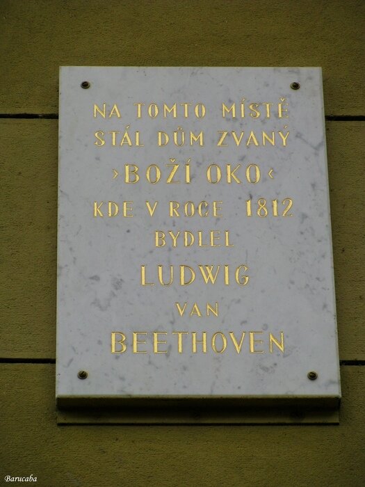 На здании кафе одного из старейших карловарских отелей, знаменитого Гранд-отеля "Пупп", есть мемориальная доска с именем Людвига ван Бетховена. Гениальный композитор дважды приезжал на лечение в Карловы Вары и дал здесь благотворительный концерт, который состоялся в «Чешском зале» 6 августа 1812 г. в пользу жителей пострадавшего от пожара курортного города Баден у Вены. Гранд-отель "Пупп" На этом месте в начале ХVIII века стояли "Саксонский" и "Чешский" залы. В 1760 году в Карловы Вары приехал кондитер графа Хотека Иоганн Георг Пупп. Здесь он удачно женился, со временем купил эти два дома и начал их перестройку в единое здание. Его дело продолжили потомки, и так в течение одного века возник большой гостиничный комплекс "Пупп". В глубине живописного парка стоит великолепный памятник гениальному немецкому композитору. Памятник был установлен в 1929 г. перед парк-отелем Richmond в южной части города. Это самая значительная работа карловарского скульптора Хуго Угера. Торжественное