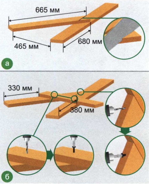 После завершения строительства или капитального ремонта в частном ломе всегда остаются доски от опалубки, временных настилов и др. В лучшем случае они попадают в топку, в худшем гниют на улице или в сарае и превращаются в мусор. Однако если подойти к делу с точки зрения практичности и бережливости, то возле дома можно поставить удобную скамейку. Рассмотрим, как это сделать, используя доски сечением не меньше 50x100.10x120 и 35x150 мм. Инструменты для работы: карандаш, метровая линейка, ножовка, дрель, шуруповерт или отвертка. Деревянная садовая скамейка своими руками Две доски длиной 665 и 800-1200 мм накладываем друг на друга, чтобы угол короткой лег на длинную на уровне 680 мм, а расстояние между внутренними углами досок составляло 465 мм (а). По внутренней стороне длинной доски отрезаем верхний угол короткой и крепим к торцу в виде пары ножек. На них накладываем третью доску длиной 700-900 мм с отступом от нижнего угла короткой — 330 мм, длинной — 380 мм (б). Прикрепив третью доску