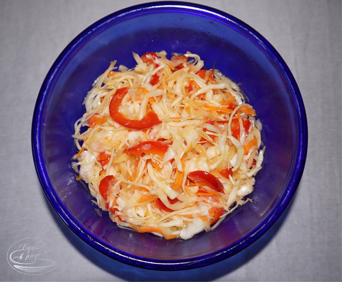Легкий весенний салатик из капусты для поднятия иммунитета и настроения. Готовлю давно, но никак не могу наесться! Ингредиенты 1. Капуста -1 кг 2. Морковь - 2 шт. 3. Репчатый лук - 1 шт. 4. Красный болгарский перец - 1 шт. 5. Растительное масло - 100 мг 6. Уксус (я предпочитаю яблочный) - 50 мг 7. Сахарный песок - 3 ст.л. 8. Соль - 1 ст.л. Способ приготовления 1. Капусту нашинковать 2. Лук и перец порезать колечками 3. Морковь натереть на тёрке 4. Смешать масло, уксус, соль и сахар в отдельной ёмкости 5. Капусту, лук перец и морковь перемешать и залить смесью из масла и уксуса 6. Все перемешать (лучше деревянной ложкой) 7. Разложить по банкам и поставить в холодильник на 2 дня Скажу по секрету, я ем её сразу! И вам приятного аппетита!