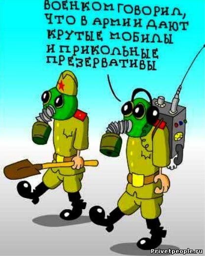 Генералу Вооружённых сил Украины задают вопрос: - Почему вы стреляете по Донбассу? - Потому что там находится российская армия. - А почему же вы не стреляете по Крыму? - Потому что там действительно находится российская армия. В ВВС ночные тренировочные полёты. Руководитель полётов запрашивает командира бомбардировщика: - Восьмой, доложите полётную видимость. - 330000 километров. - Как определили?! - Луну вижу. - Серёга из армии комиссоваться решил, по давлению. - На что давить будет? - На жалость.