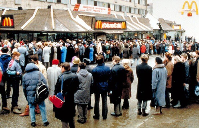 На летних Олимпийских играх 1976 года в Монреале исполнительный директор McDonald's в Канаде Джордж Кохон встретился с советскими лидерами. Вместе они обсудили предложение открыть первый ресторан в Москве. Но только четырнадцать лет спустя идея превратилась в реальность. Первый McDonald's в Советском Союзе был открыт 31 января 1990 года. На 900 рабочих мест было около 600 человек. В первый день его посетило более 30 тысяч! напротив кафе быстрого питания простиралась длинная очередь. Классический бигмак стоил 3.75рублей Даже спустя месяцы интерес к данному к бургерам у людей советского союза не пропаадал. В праздничные дни некоторые ездили в Москву просто за бургером. Например, фотограф Митя Кучелевич был одним из таких закусочных . После многих лет отдыха он вспомнил свое первое посещение наводящей на размышления истории: «Мы стояли восемь часов под палящим солнцем. У нас не было проблем, в очереди потому что мы уже привыкли стоять в очереди за продуктами. Когда мы наконец вошли в