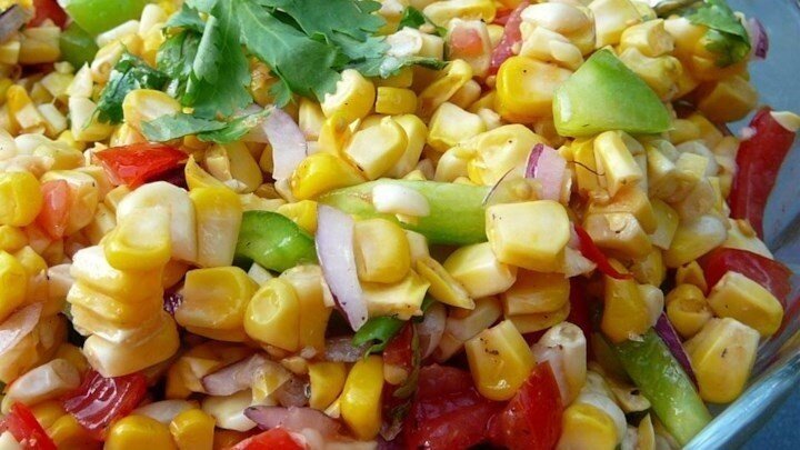 Нам понадобится: - 6 кочанов свежевыбранных кукуруза - 1 зеленый перец, нарезанный кубиками - 2 помидора, нарезанного кубиками - 1 / 4 стакана нарезанного кубиками красного лука - 1 / 2 пучка свежей кинзы - 2 чайных ложки оливкового масла - соль/перец по вкусу Делаем: Разогрейте гриль до средней температуры; слегка смажьте решетку. Готовьте кукурузу на предварительно разогретом гриле, периодически поворачивая, пока она не станет нежной и на ней не появятся черные пятна (около 10 минут). Отложите в сторону кочаны, дабы они остыли. Затем отделите ядра от початков и поместите в миску. Объедините теплые зерна кукурузы с зеленым перцем, нарезанным кубиками, помидорами, луком, кинзой и оливковым маслом. Посолите-поперчите; перемешайте. Приятного аппетита!