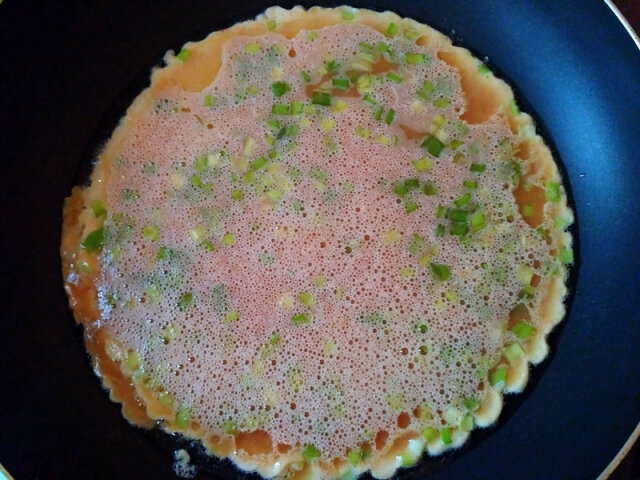 Сегодня у нас такое банальное блюдо, как омлет. Правда, в тайском исполнении оно не такое уж и банальное и гораздо вкусней классического омлета. Ингредиенты: Куриные яйца — 6 шт Мука пшеничная — 1 ст.л. Бекон, копченое мясо или ветчина — 100 гр Болгарский перец — 1 штука небольшого размера Шампиньоны — 2-5 штук в зависимости от размера Зеленый лук — пучок Рыбный соус — 3 ст.л. Устричный соус — 1 ст.л. Маринованные перчики чили — по вкусу Растительное масло Яйца взбиваем с мукой и 2 ст.л. рыбного соуса. Добавляем мелко порезанный зеленый лук, как следует перемешиваем и выпекаем на сковороде два блинчика. Ветчину нарезаем кубиками с гранью в полсантиметра. Болгарский перец и шампиньоны тоже режем помельче. В воке разогреваем масло, закидываем туда ветчину, грибы и болгарский перец, добавляем по столовой ложке устричного и рыбного соусов. Готовим, постоянно перемешивая, в течение 4-5 минут. Омлетные блинчики укладываем на тарелки, сверху размещаем содержимое вока и добавляем маринованные