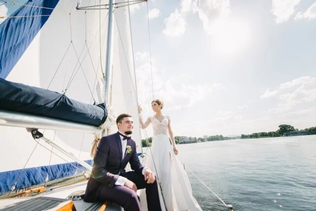 Бурное море подобно любви, оно захватывает и не отпускает, от него невозможно отвести взгляд. Наша пара Ольга и Руслан просто влюблены в море, о чем нам поспешили сообщить на первой же встрече. Сказано-сделано! Вместо сборов в отеле и традиционной прогулки мы предложили ребятам фотосессию на яхте и на этой же яхте приплыть к ресторану! Стоял солнечный июльский день, гости уже собрались на велком зоне за бокалом холодного шампанского и теплой беседой. Бармен готовил фруктовые коктейли, играла живая музыка, с залива дул свежий бриз, как вдруг на горизонте появилась яхта... Все гости знали про увлечение парусным спортом наших молодожен, но даже не догадывались, что мы предложим столь нестандартное появление на банкетной площадке! Выездную регистрацию было решено так же провести у воды на пристани. Декор был решен в зелено-бордовых тонах, а большое количество натурального дерева подчеркнуло это цветовое сочетание и добавило одновременно простоты и изящества. Настроение общей легкости и све