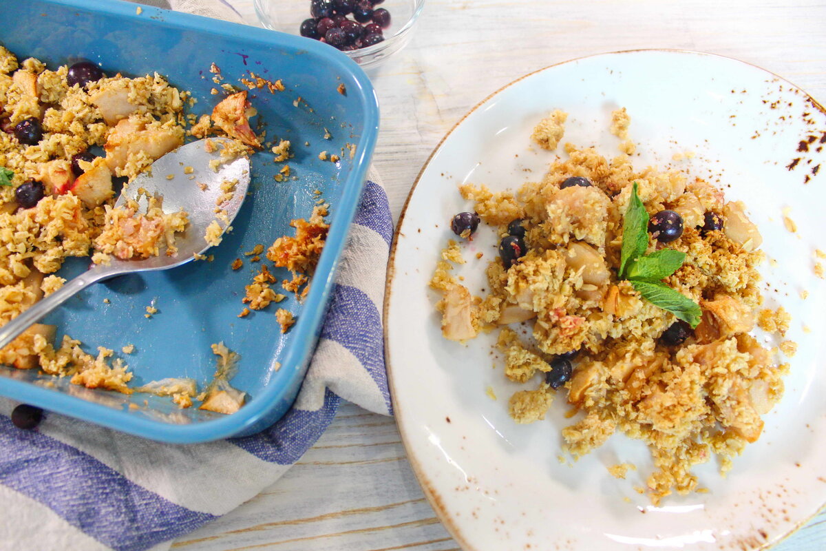 Сегодня я расскажу, как приготовить овсяный яблочный крамбл. Этот яблочный овсяный пирог прекрасный способ разнообразить завтраки из овсянки. Вкусный, быстрый и очень полезный завтрак из запеченной овсянки для Вас и Вашей семьи. Яблоки в этом рецепте овсяного крамбла можно заменить сезонными фруктами или ягодами (свежими или мороженными). В общем включаем фантазию и экспериментируем. Ингредиенты на 2 порции: Овсяные хлопья - 60 г. Сливочное масло - 40 г. Яблоки - 2 шт. Сахар - 10 г. Видео рецепт приготовления овсяного яблочного крамбла: Как приготовить быстрый яблочный крамбл из овсянки: Овсяные хлопья высыпаем в блендер и измельчим. Затем добавим сливочное масло и сахар, продолжаем измельчать в крошку. Яблоки очистим от кожуры и сердцевины. Нарежем на небольшие кусочки. Выкладываем яблоки в форму, затем сверху высыпаем крошку из овсянки. Запекаем в хорошо разогретой до 180 градусов духовке, 30 минут. Вкуснейший крамбл готов! Приятного аппетита! Не забывайте подпи