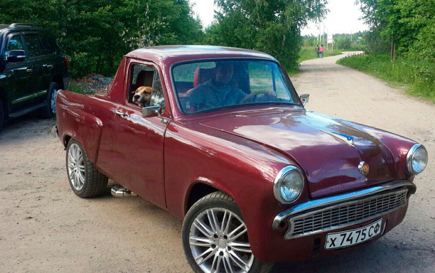 Данная вариация, всем известной машины, была выставлена на продажу в Санкт-Петербурге. Внешне автомобиль похож на El Camino, наверняка данный автомобиль выглядел бы именно так, если бы его изготавливали в нашей стране. Достаточно популярным тюнингом является переделывание старых “Волг” под пикапы, однако, чтобы для такой модернизации использовали старенький Москвич – такого ещё точно не было. Для того, чтобы предать машине более эстетический вид мастера произвели срез части крыши и сместили стекла ближе к передним дверям. Задних дверей, как будто не существовало: они были полностью заварены. Получившееся свободное пространство переделали под грузовую платформу. Согласно последним фотографиям платформа осталась не отделанной, так что право на уникальное оформление перейдёт к новому хозяину автомобиля. Новоявленный пикап оснастили комплектом литых дисков и провели монтаж современных сидений, которые обшили красной кожей. Рулевое колесо, имеющее плетение, выглядит очень вызывающе и создаё