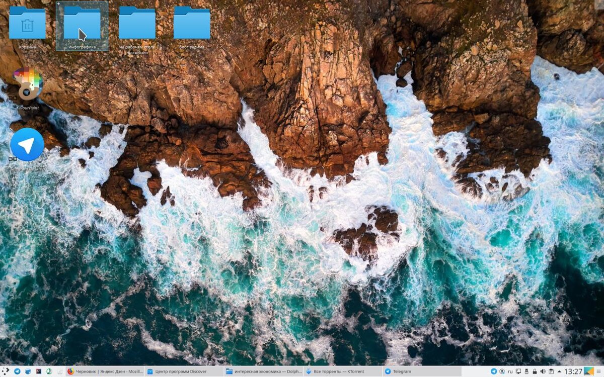 В данной статье рассмотрим как выглядит рабочий стол, и как ставить программы в Kubuntu 18.04, и так приступим : Слева внизу находятся программы быстрого доступа, на рабочем столе находятся такие же ярлыки для запуска программ, в правом нижнем углу видим системную информацию и здесь же мы отключаем и подключаем флешки. Предпочитаю крупные значки, система предоставляет весьма гибкий набор функций для настройки интерфейса, чем собственно и славится Kubuntu. К счастью, еще при установке можно выбрать русский язык интерфейса. На рабочем столе у меня виден ярлык телеграмма, как же его поставить ? Рассмотрим два варианта : 1. Используем штатный графический и немного медлительный менеджер Discover, з