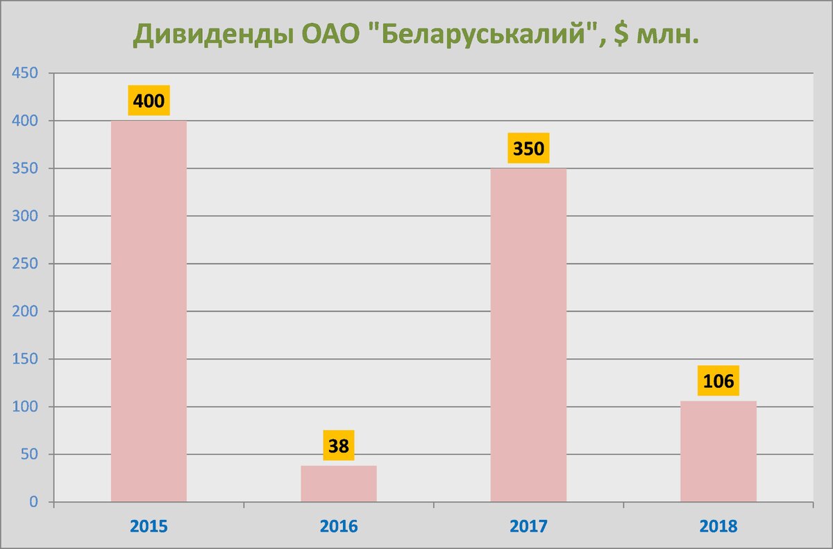 Беларуськалий торопится с уплатой дивидендов в бюджет. Государство-собственник хочет получить начисленную сумму 108,9 млн. руб. дивидендов за 4 кв. 2018г до 22 марта 2019г., то есть ранее нормативно установленных сроков предоставления финансовой отчетности. Самой бухотчетности еще нет в открытом доступе, а дивидендные платежи уже уплачены. Сумма платежа за один 4 кв. сравнима с суммой , уплаченной за три квартала предыдущего года. Этот факт можно объяснить рекордной добычей в текущем году и заключением в октябре 2018 новых контрактов с Индией и Китаем по более привлекательным ценам . На очередной год цены на поставку калия выросли с $ 230 до $ 290 за тонну. Но даже на фоне такой благоприятной конъюнктуры дивидендные платежи 2018г оказались ниже 2017г более чем в три раза. (см. диаграмму) *Незначительные выплаты 2016 года связаны с проблемами падения мировых цен на удобрения, тогда чистая прибыль «Беларуськалия» сократилась в пять раз, но и в этот период государство не отказало с