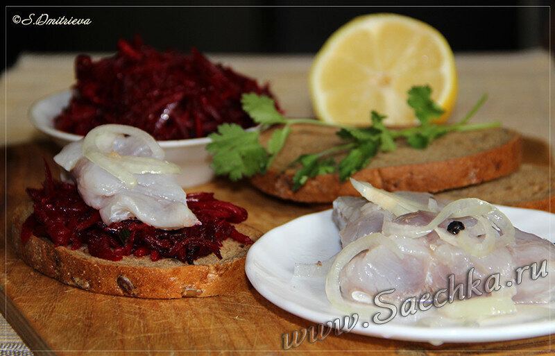 Маринованный толстолобик подан на бутерброде со свекольной икрой - наивкуснейшая закуска под запотевшую стопочку на природе! Пробуйте! Ингредиенты: Маринад: Как приготовить: