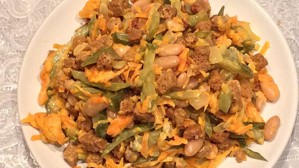 Иногда на ужин или в качестве второго блюда к обеду я подаю такой вот простой, но очень вкусный салат. Он в меру калориен, так как половина ингредиентов в нём — овощи, но при этом сытный и несложный в приготовлении. Фасоль в этом салате — главный экспонат, поэтому её нужно взять хорошего качества. Можно даже отварить её самостоятельно, но я, если честно, вечно тороплюсь, поэтому беру консервированную. С белой фасолью, на мой взгляд, салат получается нежнее, чем с красной. Продукты для недорого салата с фасолью: · 1 банка консервированной фасоли в собственном соку; · 1 луковица; · 1 морковка; · 1 ст. л. растительного масла; · 2 зубчика чеснока; · 2 крупных или 3 средних маринованных или солёных огурца; · 200 г сухариков из чёрного хлеба (лучше домашних, собственного приготовления); · соль по вкусу; · 1-2 ст. л. постного майонеза по желанию. Как я готовлю недорогой салат с фасолью: 1. Очищенную морковь натираю на крупной тёрке, а луковицу режу кубиками. Обжариваю измельчённые овощи в го
