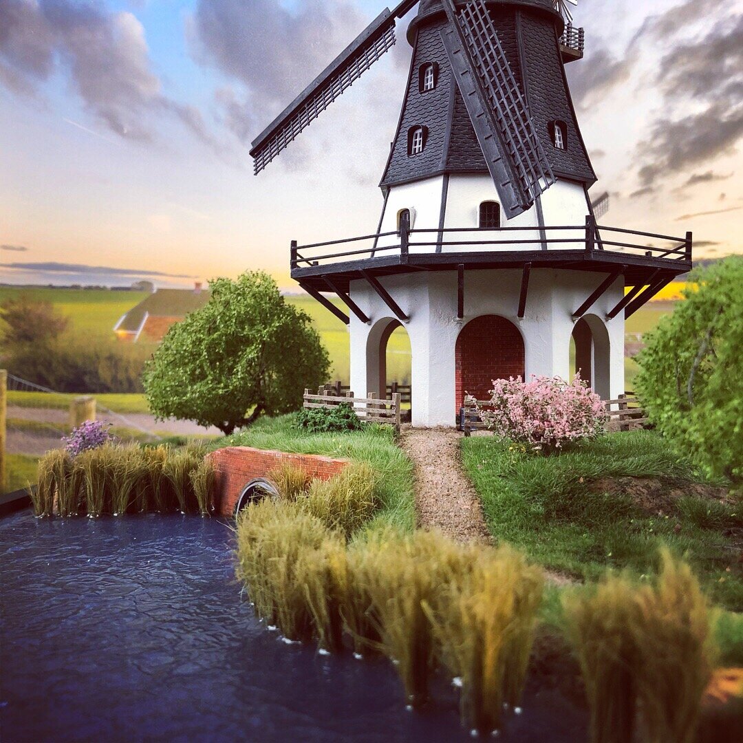 Все части мельницы моделил в трехмерном редакторе cinema4D, части мельницы печатал на двух принтерах anycubic photon и wanhao d8. Воду сделал из эпоксидки,а с помощью клея сделал реалистичную поверхность воды.