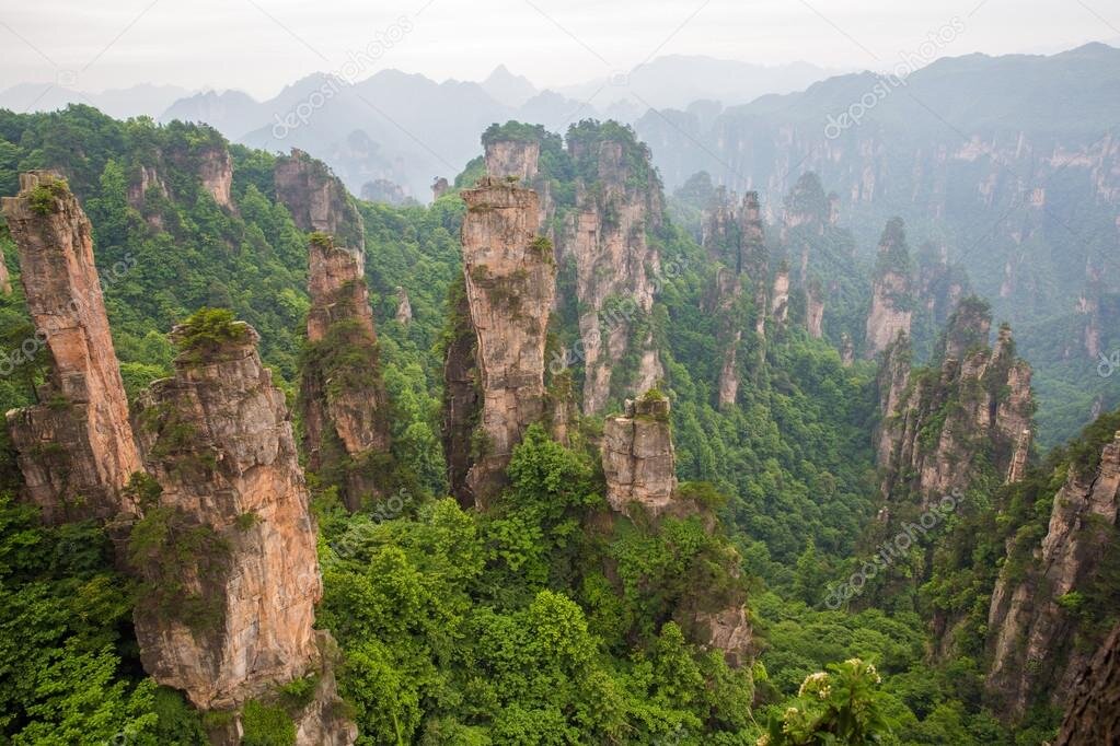 В Китае. В ста семидесяти милях к северо-востоку от городского округа Чанши находятся три тысячи огромных столбов песчаника. Это Улинъюань, часть горной системы Улиншань. Невероятной красоты причудливые пики и утесы, более чем двести метров в высоту, похожи на громадные башни. Это один из ошеломляющих природных объектов в мире. Столбы из кварцита и песчаника являются карстовыми форм