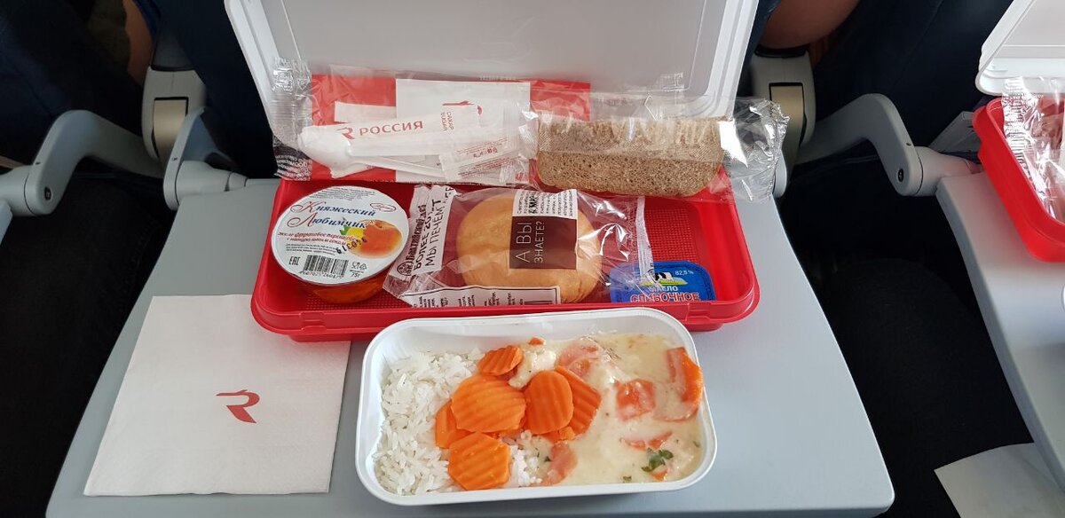 Заказывать питание заранее нельзя, но можно было выбрать в обоих случаях из двух вариантов. Сначала всем дали воды, газировки или сока (почему-то только апельсинового), затем каждый мог выбрать два варианта питания: Питание на пути туда: Вариант 1: курица с рисом и морковью, хлеб, сок, булочка, масло. Вариант 2: котлета из говядины с макаронами и горохом,хлеб, сок, булочка, масл