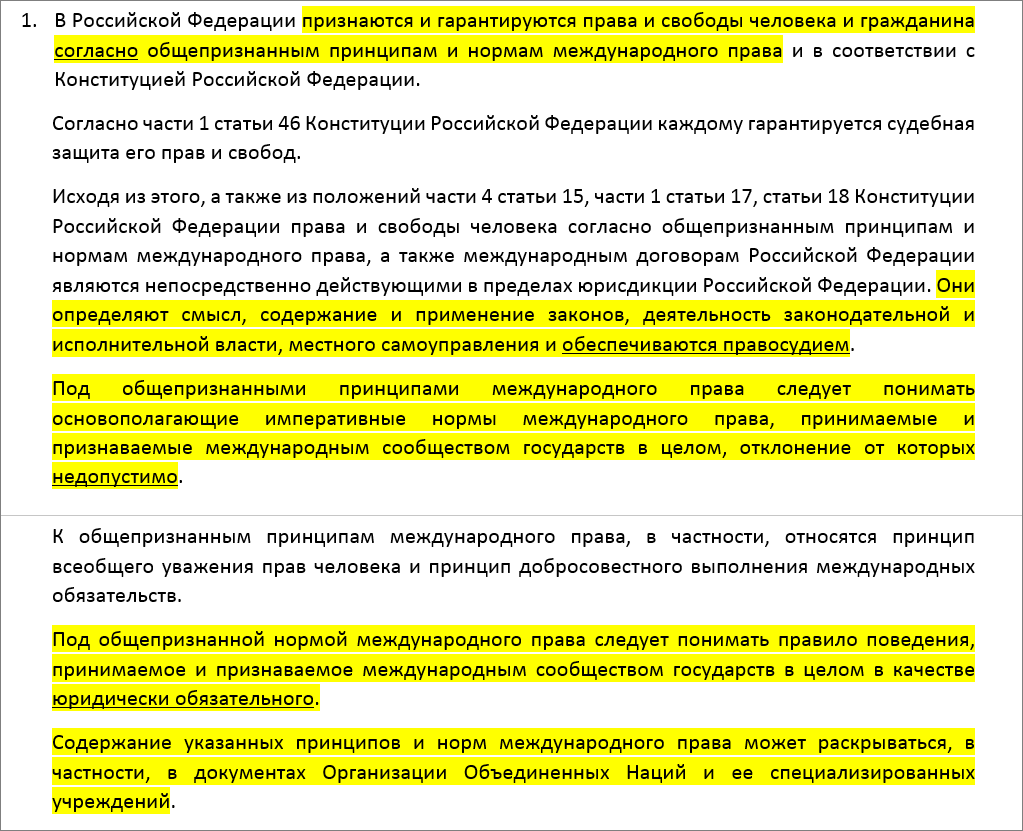 Общепризнанные принципы и нормы междунородого права "Они определяют СМЫСЛ, СОДЕРЖАНИЕ и ПРИМЕНЕНИЕ законов, деятельность законодательной и исполнительной власти, местного самоуправления и обеспечиваются правосудием". Каким образом авторы согласовывают содержание законов с общепризнанными принципами и нормами междунородного права мне не известно