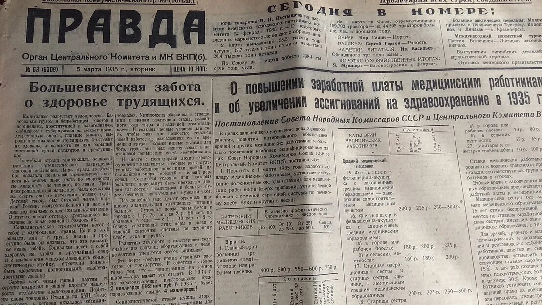 С трудом верится во все написанное… Действительно было так?.. Держу в руках газету. Странное чувство. Это «ПРАВДА» от 5-го марта 1935 года. Орган ЦК и МК ВКП(б). Две передовые статьи – «Большевистская забота о здоровье трудящихся» и «О повышении заработной платы медицинским работникам и об увеличении ассигнований на здравоохранение в 1935 году». А что еще происходило в стране в тот год? - В январе на экраны вышел фильм «Юность Максима». -Февраль – запущен первый испытательный поезд Московского метрополитена. - В марте на Кузнецком металлургическом комбинате был введен в эксплуатацию самый крупный в Европе цех по производству горячекатаного листового проката. - Апрель – организованно добровольное физкультурное общество «СПАРТАК». (19 апреля, если для кого-то это важно.)))) - Май – подписание Советско-Французского и Советско-Чехословацкого договоров о взаимной помощи. - Июль – постановление СНК СССР «О выдаче сельскохозяйственным артелям государственных актов на бессрочное (вечное)