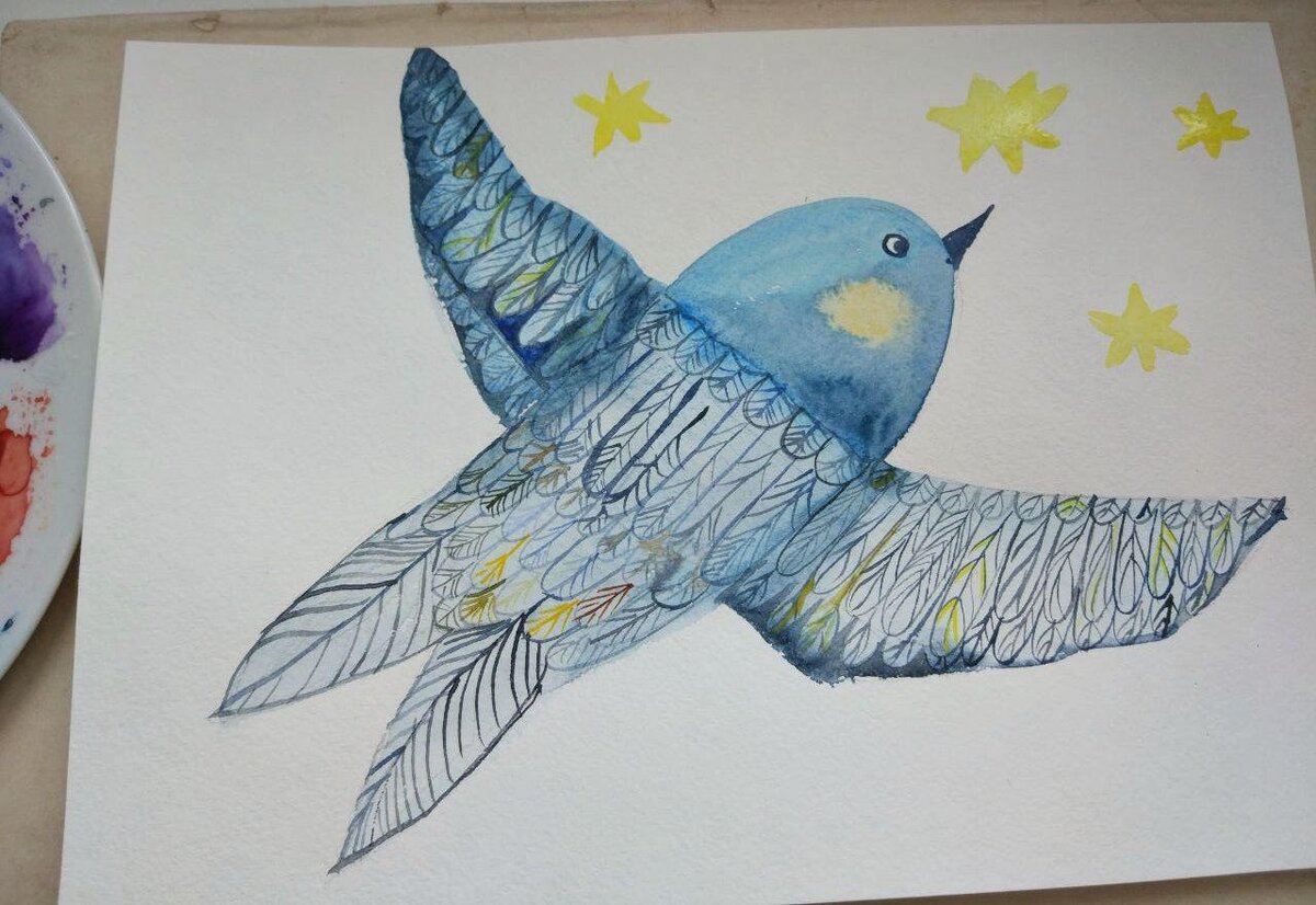 Будем продолжать рисовать! Все согласны? Я нарисовала несколько картинок на весеннюю тему, сначала их отрисовала акварелью, как эскиз, а потом планирую нарисовать самые лучшие в акриле. После этого нарисую картинки на футболках для детей. Доставайте листок бумаги для акварели, кисточки, да краски. Начинаем рисовать! У вас получится, да-да, и у тебя тоже! Вот что у вас примерно получится! 1. Рисуем набросок. Сначала рисуем набросочек легонько на бумаге, контуры перья можно не рисовать. Мы их потом сразу на бумаге красками нарисуем. 2. Делаем заливку. Потом начинаем делать основные заливки цветом. Легко набираем светло-голубой и синий цвет и заливаем им птичку с головы до хвоста. Пока бумага сырая вплавляем в цвет - щёчку (капля лимонного). По мокрой бумаге рисуем фон для крыльев. Так очертания размоются и не будет четких линий. Потом рисовать перья будет намного удобнее. 3. Рисуем дальше. Приступаем к конкретике. Рисуем глаз, клюв и перья на спинке. 4. Рисуем перья на спинке. Вооот!