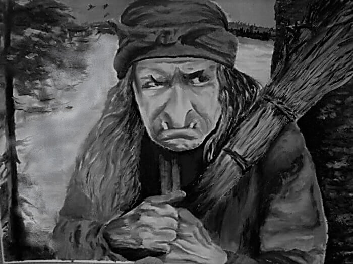 В то время умер один старец. Его по обычаям в белые одежды обрядили и в «дом на ножках» понесли. А там дверь заперта изнутри. Стали кричать, чтобы дверь отворилась. Тут из избы вышла старая, страшная бабка. Волосы седые, да всклоченные, одежда грязная, да разорванная. Огромный горб на спине, одна нога костяная, другая человеческая. Длинный нос в грудь врос. Руки похожи на гнилые ветки болотных деревьев. Не признали они в ней красавицу – богатыршу Ядвигу Виевну.