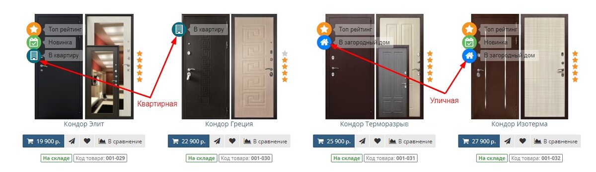 Итак, нам нужно понимать, что между входной дверью в квартиру и уличной входной дверью - есть большие различия! Дело в том, что практически любую уличную дверь, можно установить как входную в квартиру, но вот двери, которые предназначены для установки только в квартиру - нельзя ставить в загородный дом! Это обусловлено тем, что квартирные входные двери не имеют дополнительную защиту от попадания влаги на внешнюю сторону полотна и со временем внешняя панель придёт в негодность! Из-за конденсата, который образовывается при больших перепадах температуры, внутренняя панель также со временем начнёт разбухать и придёт в негодность! На нашем сайте есть специальные обозначения таких дверей: Но есть и такие двери, которые можно устанавливать как в квартиру, так и в загородный дом! На нашем сайт